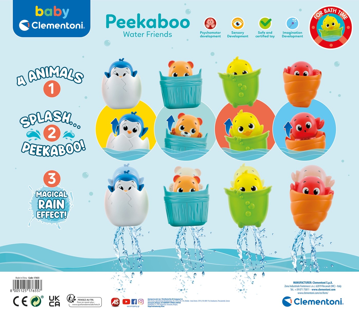 Al sumergir a los simpáticos amigos en el agua, entran en acción: el cangrejo asoma desde su concha, el pingüino sale del huevo y el pato y el osito se levantan de la bañera y del cubo.