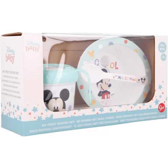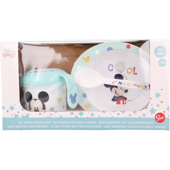 Mickey Mouse vajilla infantil para las primeras papillas del bebé decorado con sus personajes favoritos. Incluye 3 piezas: un cuenco, una cuchara y una taza de transición con asas de 250 ml para desarrollar su habilidad para beber y comer por sí mismo. Apto para microondas. A partir de 10 meses. Tamaño: 21×7 cm.