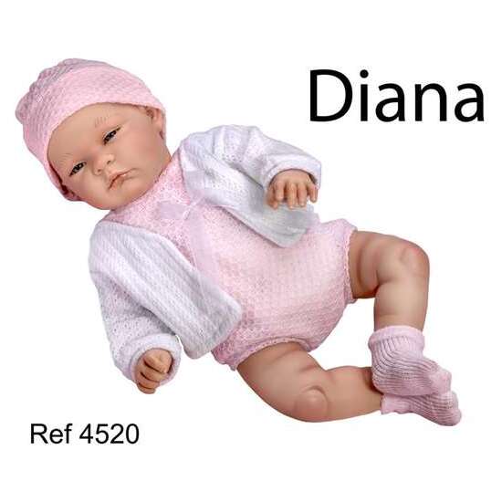 Muñeca Reborn Diana con pelele, chaqueta y gorro rosa 46 cm (1.500 gr). Edad minima recomendada 12a. No Montaje necesario. No Utiliza pilas. No Emite sonidos. No Tiene luces. Idiomas caja ES|FR|EN|DT|PT|NL|IT|RU. Idiomas instrucciones ES|FR|EN|DT|PT|NL|IT|RU. Idioma producto ES. Contenido caja MUÑECO