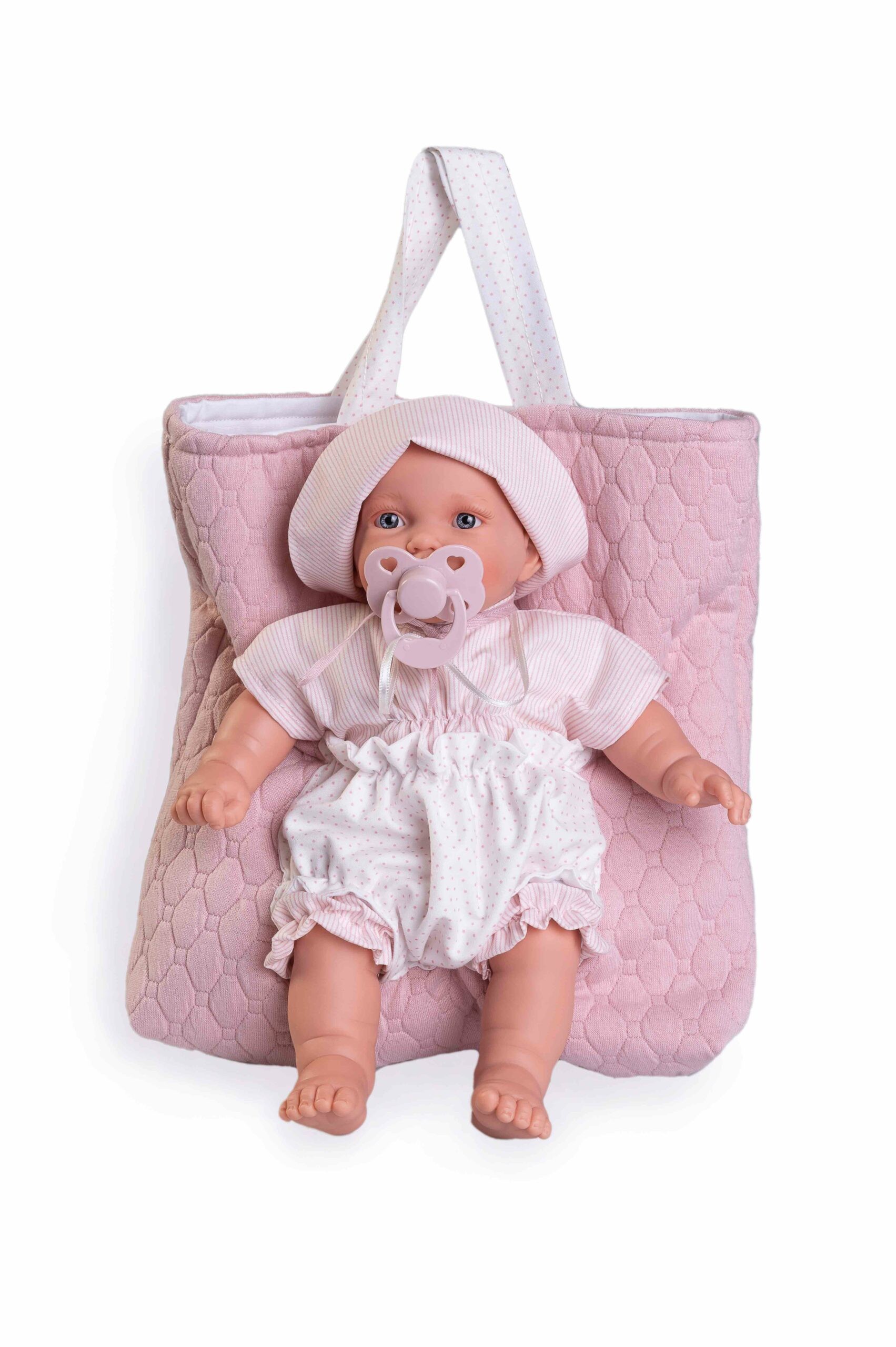 Petit es una muñeca para la Primera Infancia, para niños y niñas a partir de los 2 años. Como a Petit le gusta mucho ir de paseo, ¡te la puedes llevar en su bolso portabebé allá dónde vayas! Está guapísima con su pelele y su gorro a juego. y ¿Que me dices del bolsito? Coloca a Petit en el y juega con ella donde tu quieras. Petit es una muñeca con mecanismo de sonido, de Muñecas Antonio Juan. Tiene una carita muy simpática. Si le aprietas la barriguita se rie y llama a sus papás y se rie. Tiene el cuerpo de tela blandito para que le puedas dar suaves abrazos y las extremidades de suave vinilo. Mide 27 cm y pesa 386 gr. ¿Dónde te la vas a llevar hoy de excursión?