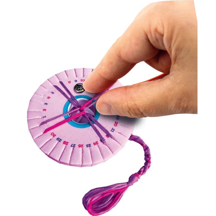 El juego incluye una herramienta especial para tejer pulseras con hilos y cuentas de colores.