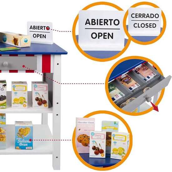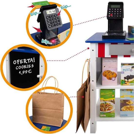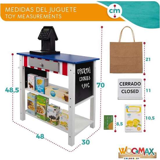 Supermecado de madera Woomax con 25 accesorios y caja registradora eléctrica 48X30XH70 cm. Edad minima recomendada 3a. Edad minima advertida 3a. Sí Utiliza pilas. Tipo pilas AA. Sí Tiene luces. Material WOODEN+PLASTIC PARTS