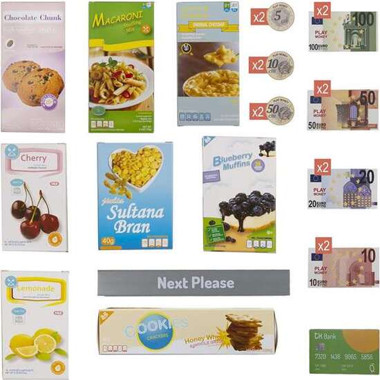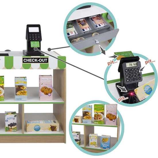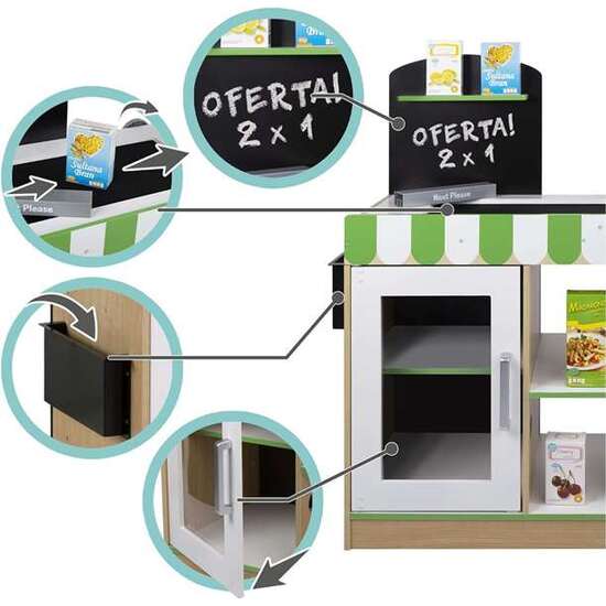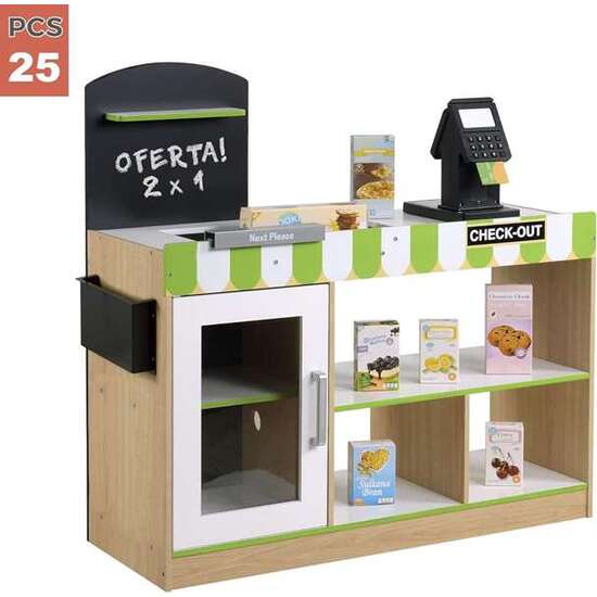 Supermercado de madera con 25 accesorios y caja registradora eléctrica 80X30XH80 cm . Edad minima recomendada 3a. Sí Utiliza pilas. Tipo pilas AA. Sí Tiene luces. Número jugadores 2. Material WOODEN+PLASTIC PARTS